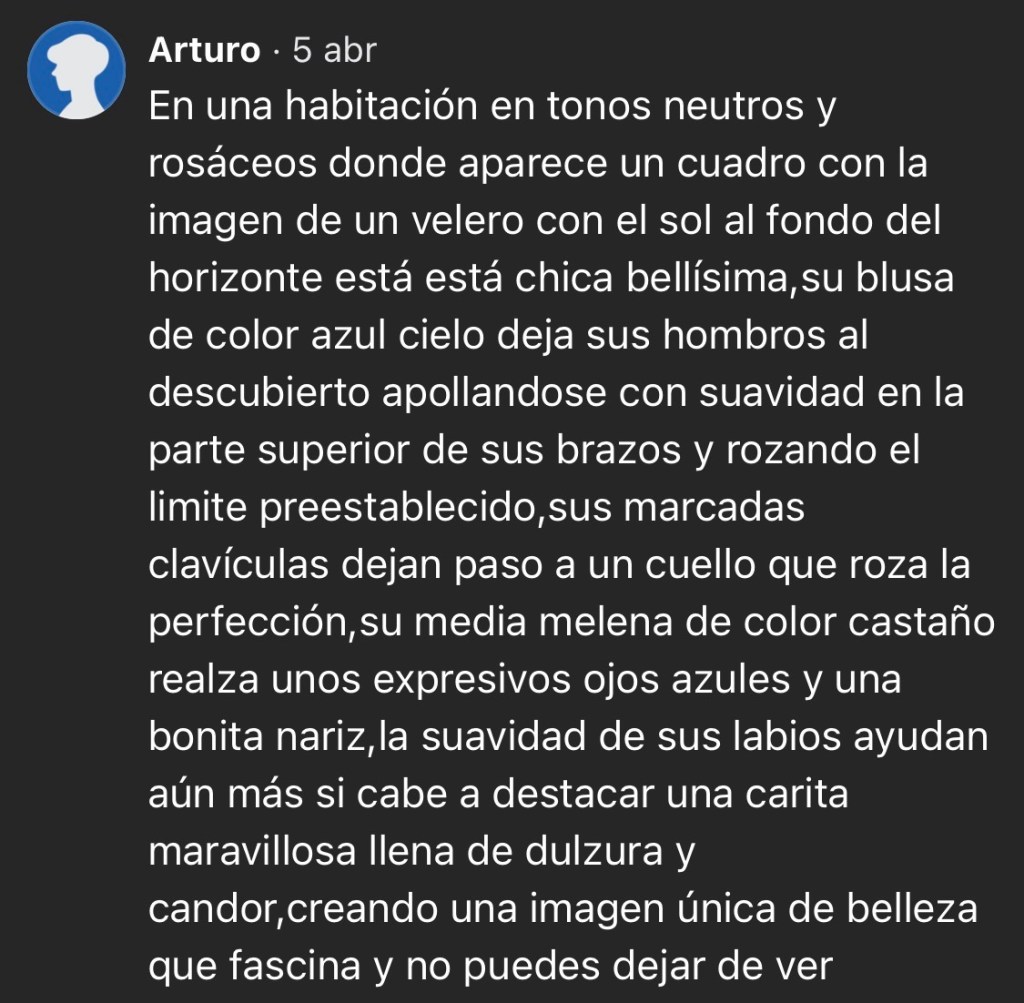 El cabello enmarca el rostro con una calma cercana, y la expresión sostiene una invitación que no empuja. Todo ocurre en un registro bajo: la tela que cae, la piel que aparece sin anuncio, la postura relajada que no busca corregirse. El espacio se ordena alrededor de esa presencia sentada, contenida, suficiente. No hay dramatismo ni exceso; solo la certeza de que a veces basta una blusa bien dispuesta y unos hombros descubiertos para que la escena se vuelva memorable.