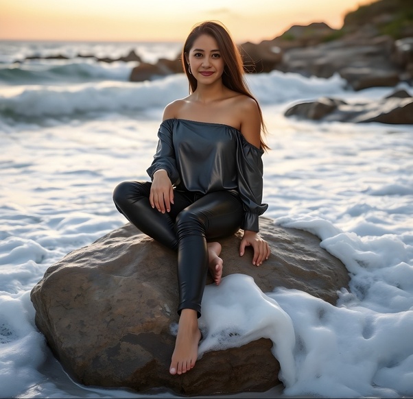 La brisa llega primero a los hombros, cargada de sal y de una frescura que no empuja, sino que se posa. La blusa, suave y satinada, responde al aire con un movimiento leve, casi distraído, y deja que la piel reciba el rumor del mar sin mediaciones. La espuma avanza y retrocede con una paciencia antigua, rodeando la piedra, retirándose, volviendo. El sonido se fragmenta: un golpe opaco contra la roca, un deslizamiento húmedo, el susurro breve cuando el agua se repliega. Desde allí, el mundo se ordena en capas superpuestas: aire, tela, piel, distancia. El horizonte permanece estable mientras todo lo demás oscila.