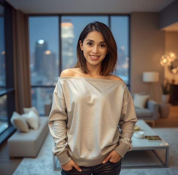 La prenda cae con una holgura medida, dejando al descubierto una franja mínima de piel, casi accidental, como si hubiera ocurrido sin intención. No es una revelación, sino una tímida insinuación: el borde desciende apenas, lo justo para que el aire toque la superficie y la mirada se detenga un instante más de lo necesario. El elástico sostiene sin apretar, permite que la tela se desplace con libertad y que ese gesto involuntario permanezca. La luz interior, suave y estable, convierte esa porción de piel en un punto de calma, una pausa breve en el conjunto.