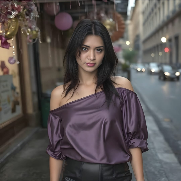 El mundo se ofrece desde esa altura precisa, como si la mirada naciera en la línea donde termina la tela. Los hombros, expuestos al aire de la calle, reciben primero la temperatura del día: un frío leve, urbano, mezclado con humedad y movimiento. La ciudad no se presenta como panorama, sino como una sucesión de brillos y distancias: luces que se encienden antes de ser necesarias, fachadas que se deslizan a los lados, un murmullo constante que no exige atención. La blusa, satinada y flexible, responde a cada paso; se pliega, se tensa, se acomoda sin fijarse del todo, recordándole al cuerpo su presencia a través del roce continuo. La piel reconoce el contraste: suavidad arriba, aire directo, una exposición contenida.