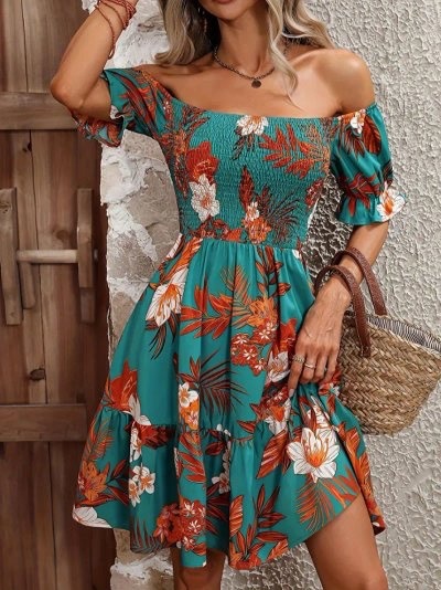 Vestido tropical con hombros descubiertos, mangas con volantes y detalles de volantes para mujer.