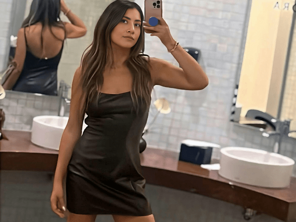 No es descaro, o no en el sentido urgente de la palabra. Es algo más lento: la conciencia de que verla basta. El gesto se apoya en esa convicción silenciosa de que la imagen, por sí sola, derrite sin pedir permiso. La textura del vestido —brillosa, líquida, resbalosa— acompaña esa idea: no se impone, se desliza. Todo ocurre en un equilibrio exacto entre saber y dejar que ocurra. Y en ese punto, la mirada no seduce: confirma.