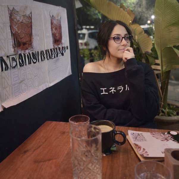 La escena huele a café recién servido y a una pausa robada al ruido del día. Ella se sienta como quien piensa en voz baja: el codo sobre la mesa, los dedos rozando los labios, la mirada perdida un poco más allá del vidrio. La sudadera negra cae amplia, deliberadamente relajada, dejando los hombros al aire como si el gesto no hubiera sido planeado, como si el cuerpo hubiese decidido por sí solo respirar. Las gafas ordenan el mundo; detrás de ellas, los ojos no miran, evalúan. Afuera, las hojas grandes y la noche urbana se confunden, y el cartel de Negroni repite su mantra como un eco: beber, esperar, volver a pensar.
