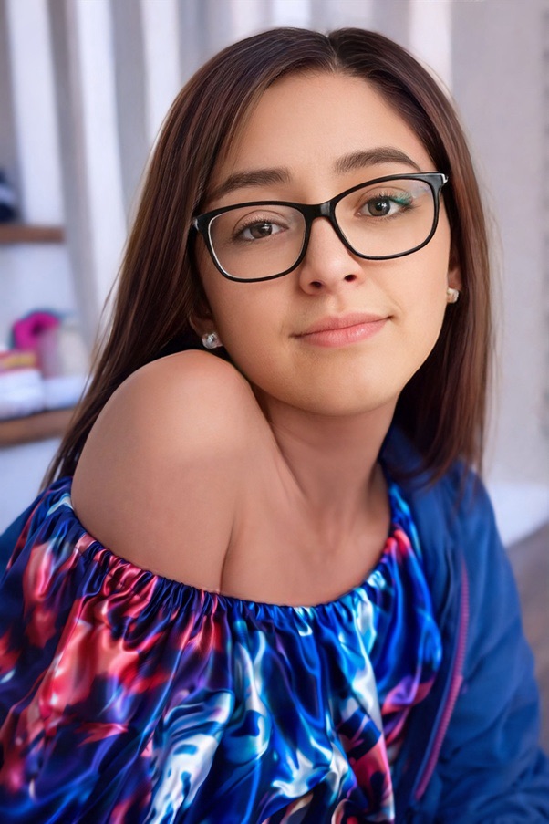 Hay una calma íntima en la escena, como si el tiempo se hubiera sentado a observar. La tela, un remolino de azules y magentas, parece moverse aun estando quieta, ceñida por un elástico que decide —con suavidad— dejar un solo hombro al aire. Ese gesto mínimo ordena todo: la piel clara toma la luz con naturalidad, las gafas enmarcan una mirada que no busca imponerse, solo estar. El cabello cae liso, obediente, y el rostro guarda una serenidad que no necesita explicación.