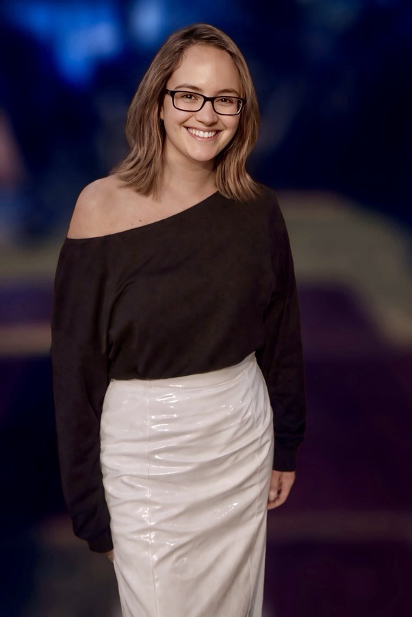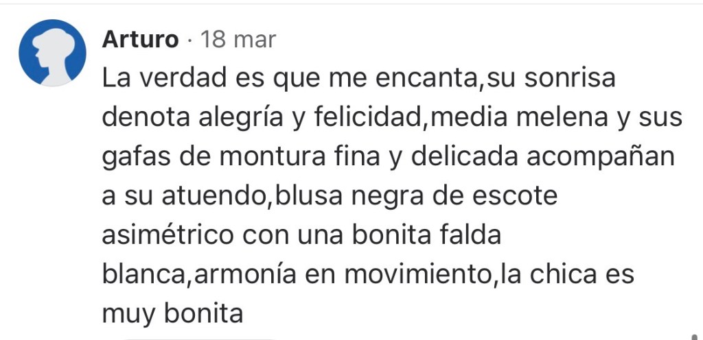 Ella aparece como una nota clara en un fondo que se disuelve, una presencia que no necesita levantar la voz para imponerse. La blusa negra cae en diagonal, suave y despreocupada, dejando un solo hombro al aire, como una confidencia dicha a media voz. El tejido es mate, dócil, casi tímido frente a la piel, y ese contraste lo vuelve más elocuente. La sonrisa —abierta, franca— no pide nada, pero concede mucho: calma, cercanía, una confianza inmediata que desarma. Las gafas enmarcan la mirada sin endurecerla; al contrario, la vuelven más humana, más real.