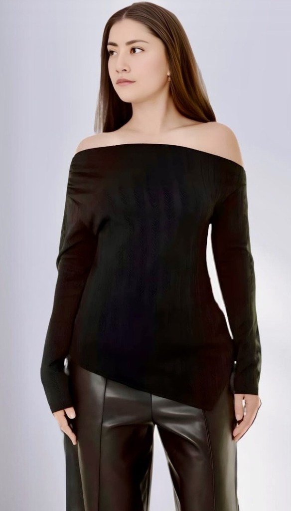 Como una noche bien pensada, recta y silenciosa, dejando los hombros al aire con una sobriedad que no pide permiso. No es un gesto dramático: es una línea limpia, una pausa en la tela donde la piel respira y el tiempo se vuelve atento. El tejido, mate y contenido, acompaña el torso sin imponerle forma, como si supiera que la elegancia aquí consiste en no interrumpir. El cabello liso enmarca el rostro con disciplina suave; la mirada se fuga hacia un costado, concentrada, ajena al ruido, como quien escucha una música interior.