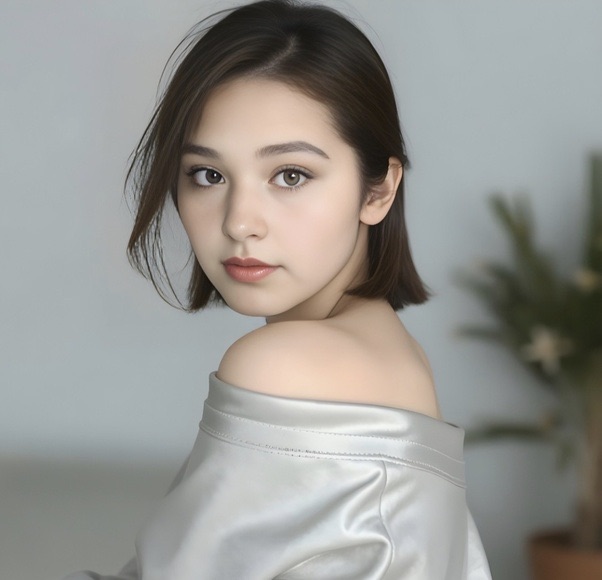 Una blusa de satén en tono plateado claro envuelve los hombros con una caída suave que deja uno de ellos al descubierto. La tela, lisa y brillante, refleja la luz con un resplandor delicado que resalta los pliegues y la textura sedosa del tejido. El encuadre cercano enfatiza el rostro y la línea del cuello, creando una composición íntima y equilibrada. El cabello corto, peinado con una ligera inclinación hacia un lado, enmarca las facciones con naturalidad. La mirada directa y tranquila, acompañada por una expresión serena, aporta una sensación de calma y presencia.