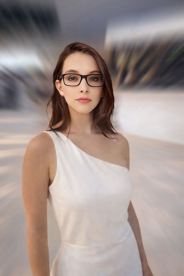 … en una estela de movimiento, como si todo avanzara menos ella. El vestido blanco, liso y contenido, cae con precisión sobre el cuerpo y deja un hombro expuesto: una línea clara, serena, que corta el aire. La tela habla de ligereza y control; la postura es firme, frontal, sin gesto superfluo, como una pausa consciente dentro del desplazamiento.
