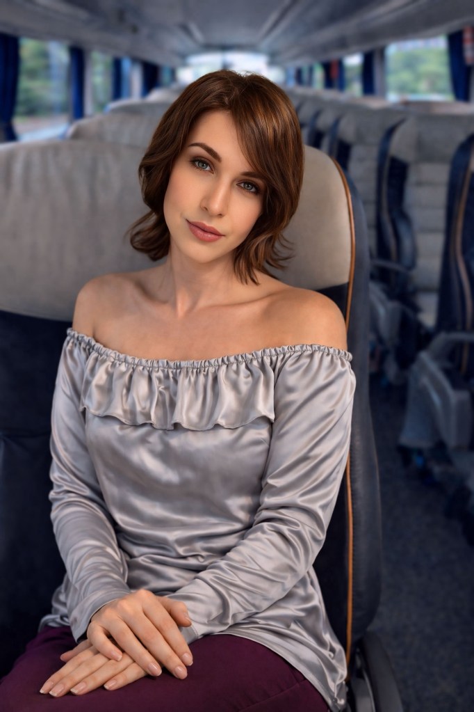 La sonrisa se inclina ligeramente, cercana, casi conversacional. No busca detener el viaje, sino habitarlo. Entre asientos, ventanas y camino, el instante se sostiene en tránsito, sin perder su centro, recordándonos una verdad innegable de los destinos: que las guapas, también viajan en autobús.
