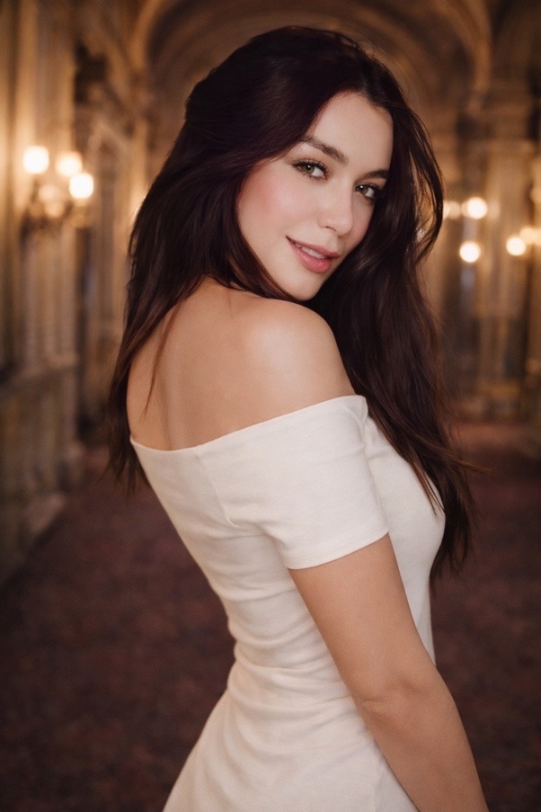 Un vestido claro, de líneas limpias, se ajusta sin rigidez y deja los hombros al aire que marcan el gesto desde el inicio. La tela cae con una suavidad que no busca destacar, pero termina por hacerlo, siguiendo la curva del cuerpo con precisión tranquila. El cabello suelto acompaña sin interferir, y el conjunto se sostiene en esa idea simple: nada sobra, nada falta.