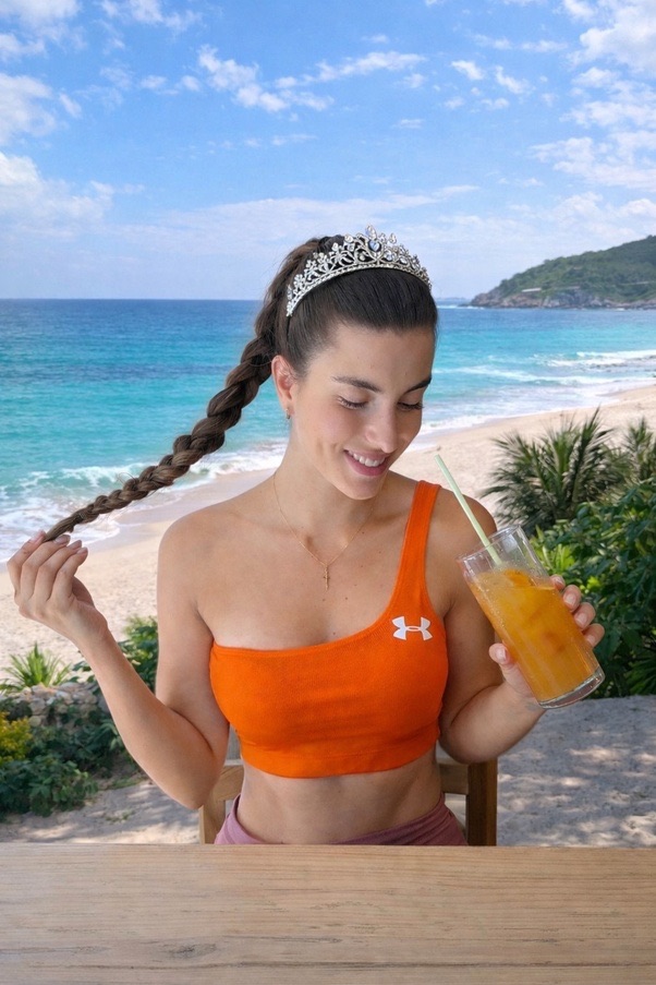 Entre los dedos, la trenza se desliza como un juego distraído. En la otra mano, el vaso con jugo atrapa reflejos dorados, prolongando la sensación de frescura. Su sonrisa no busca fijarse en la cámara; se inclina hacia abajo, como si el instante le perteneciera sólo a ella.