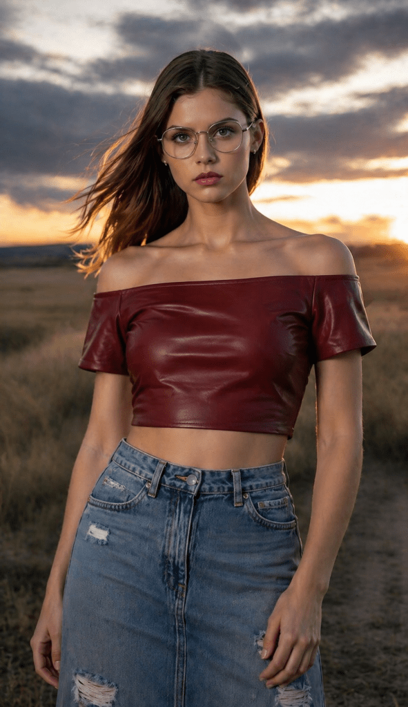 Los dos hombros quedan expuestos con claridad, sin gesto accidental ni descuido: son visibles, firmes, presentes. No hay coquetería en esa apertura, sino una franqueza casi estructural, como si el cuerpo se ofreciera al viento de la llanura con la misma honestidad con la que el paisaje se ofrece a la mirada. La prenda se sostiene en su lugar mientras deja que la piel dialogue con el aire, sin conflicto.