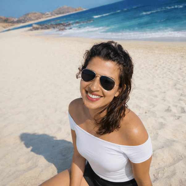 La playa se abre como una página en blanco y, sobre ella, el cuerpo escribe con sencillez una frase imposible de borrar. Los hombros descubiertos reciben el sol sin defensa, como si la piel entendiera desde siempre el idioma del mar. La camiseta blanca, limpia y precisa, se tensa apenas con el gesto natural de sentarse, dejando que la línea del cuello dialogue con el horizonte. Las gafas oscuras guardan el misterio, pero la sonrisa —amplia, franca— lo traiciona todo: aquí no hay pose, hay presencia.
