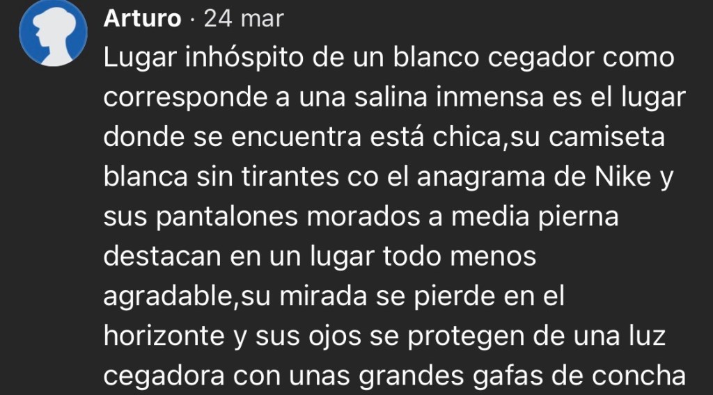 El paisaje es casi abstracto en su simplicidad: una vasta extensión blanca que se prolonga sin interrupciones hasta encontrarse con una franja lejana donde el terreno y el cielo se separan. La luz es intensa y uniforme, sin sombras duras, lo que aplana parcialmente las formas y amplifica la sensación de amplitud. El azul del cielo, limpio y sin ruido visual, actúa como contrapunto al blanco dominante del suelo. La composición se apoya en esa horizontalidad extrema, donde ella emerge como único punto de referencia vertical, anclando la escena en medio de un espacio que parece infinito.
