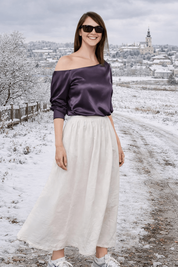 La falda clara cae larga y ligera, rozando la nieve con un movimiento casi ceremonial, mientras el camino helado se abre detrás. El invierno se soporta sin dramatismo: el hombro desnudo no busca calor, busca equilibrio. En Wieluń, la elegancia también aprende a endurecerse.