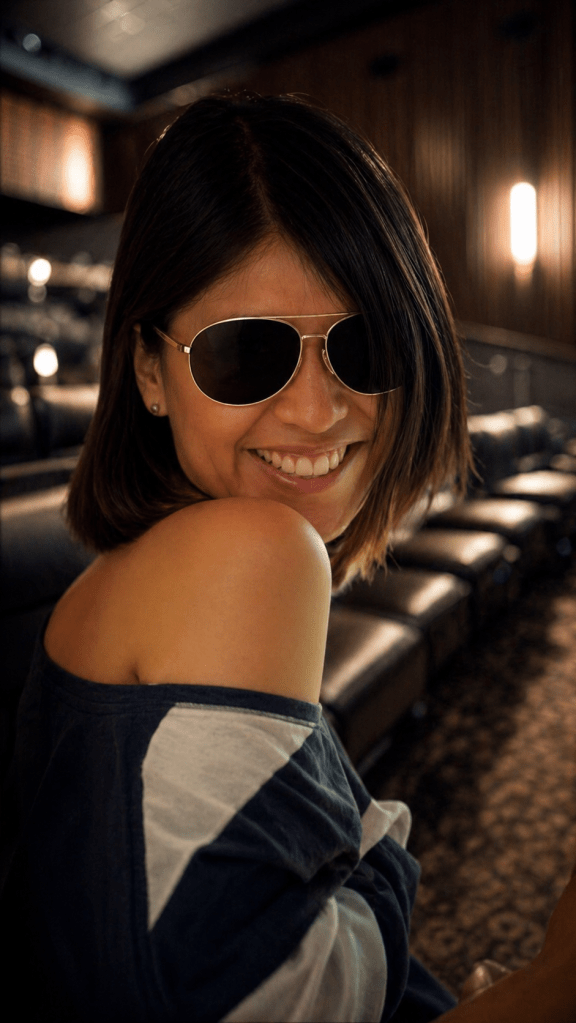 En primer plano, ella rompe esa quietud con una presencia cálida. La blusa blanquinegra descansa sobre sus hombros con una soltura profunda que denota la mezcla de comodidad y glamour. El tejido se pliega con elegancia alrededor del hombro descubierto, creando una línea luminosa que contrasta con la penumbra del fondo. Su postura —ligeramente girada, mirando por encima del hombro— introduce una sensación de cercanía inesperada. El cabello corto enmarca su rostro con precisión, y su sonrisa amplia ilumina la escena con una naturalidad tranquila. Entre la textura brillante de la blusa, la curva del hombro y la profundidad ordenada del auditorio, la composición equilibra intimidad y amplitud en un mismo instante.