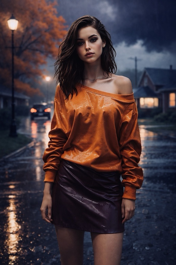 Ella permanece en medio de esa escena como un punto de intensidad serena. La blusa, empapada, se adhiere con suavidad a su cuerpo, el tejido oscuro adquiriendo un brillo irregular bajo la lluvia mientras deja un hombro al descubierto, donde el agua resbala en trazos casi imperceptibles sobre la piel. La falda, de textura más firme, recoge la luz en reflejos profundos, añadiendo contraste y densidad al conjunto. Su postura es firme pero sin rigidez, los brazos relajados, el cuerpo alineado con una naturalidad que no desafía la tormenta, sino que la acepta. El cabello húmedo cae en mechones sueltos, y su mirada, directa y contenida, parece sostener el instante con una calma que transforma la lluvia en parte de su presencia.