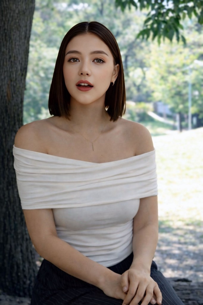 La blusa clara, ceñida y de corte amplio en el escote, deja los hombros al descubierto y recoge la claridad del entorno. Hay una continuidad entre la tela y la luz, como si ambas compartieran la misma materia tenue.
