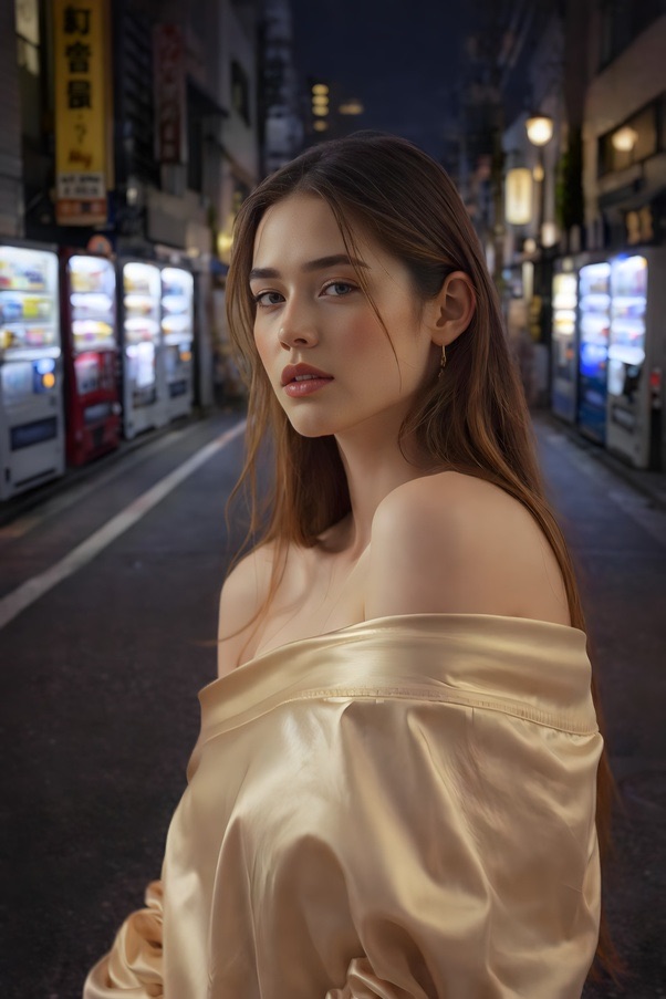 En Tokyo, la noche cae con una suavidad casi calculada, como si la ciudad quisiera alargar unos minutos más ese instante suspendido entre lo que fue descanso y lo que será regreso. Ella se detiene en medio de la calle, envuelta en el brillo tenue de los escaparates y la luz fría de las máquinas alineadas a ambos lados, y todo a su alrededor parece ralentizarse.